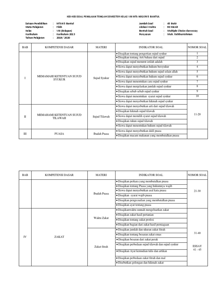 Pilihlah a b c atau d dengan tanda silang X sebagai jawaban yang paling benar. Kisi-kisi UKK UAS Fiqih Kelas 8 MTs Semester 2. Demikian yang dapat mimin bagikan terkait contoh soal PASUAS FIQIH Kelas 7 8 9 SMPMTs Semester 1 Kurikulum 2013 sesuai KMA No 183 Tahun 2019 ini semoga dapat membantu rekan-rekan Ruang Pendidikan dalam mempersiapkan soal-soal PASUAS yang akan digunakan dalam kegiatan Penilaian Akhir Semester.