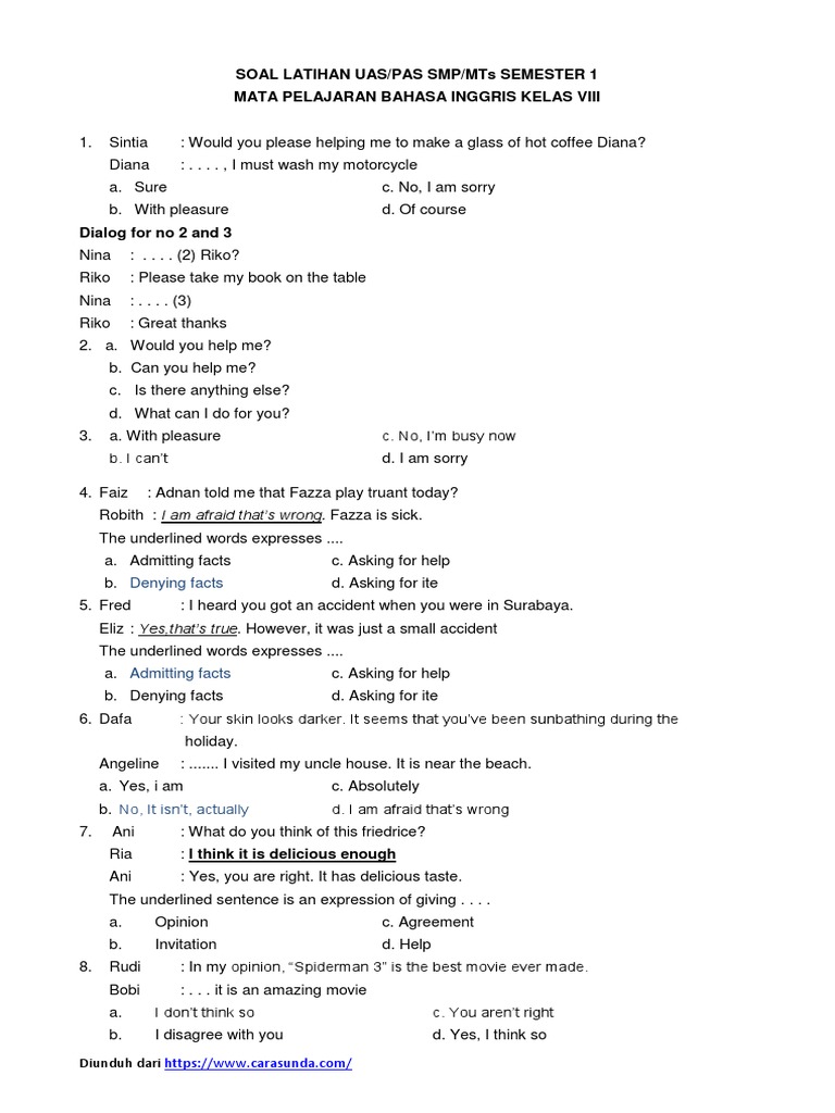 40 Contoh Soal Uas Bahasa Inggris Kelas 8 Smp Mts Dan Kunci Jawaban Docx Linguistics