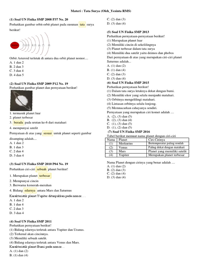 Doc Latihan Soal Kelas 7 Semester 2 Sistem Tata Surya Rika Latustita Academia Edu